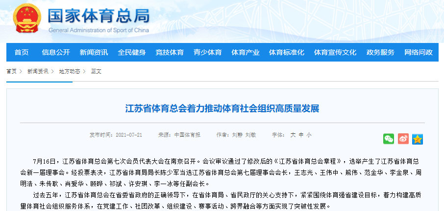 2021-08-067月16日,江苏省体育总会第七次会员代表大会在南京召开。会议审议通过了修改后的《江苏省体育总会章程》,选举产生了江苏省体育总会新一届理事会。