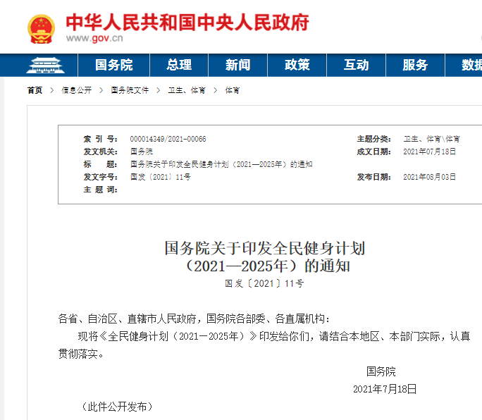 2021-09-13“十三五”时期,在党中央、国务院坚强领导下,全民健身国家战略深入实施,全民健身公共服务水平显著提升,全民健身场地设施逐步增多,人民群众通过健身促进健康的热情日益高涨,经常参加体育锻炼人数比例达到37.2%,健康中国和体育强国建设迈出新步伐。同时,全民健身区域发展不平衡、公共服务供给不充分等问题仍然存在。为促进全民健身更高水平发展,更好满足人民群众的健身和健康需求,依据《全民健身条例》,制定本计划。