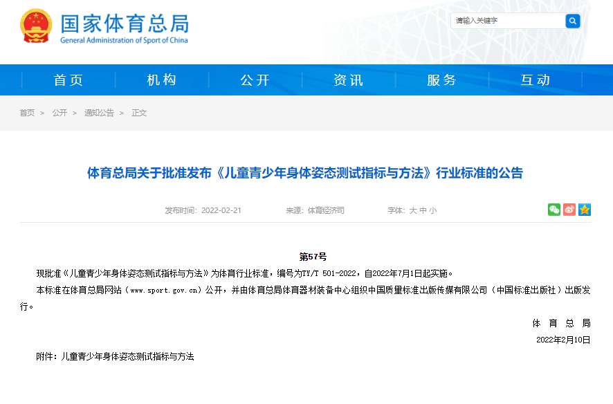 2022-03-112月21日,国家体育总局批准发布《儿童青少年身体姿态测试指标与方法》为体育行业标准,编号为TY/T 501-2022。
