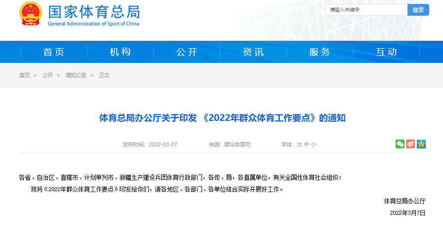 2022-03-242021年以来,全国群众体育工作在规划政策制定、解决“群众去哪儿健身”、推动群众体育赛事活动体系化、加强政策研究、标准制定和基础工作等方面,取得了新成效。特别是北京冬奥会的成功举办以及中国体育代表团参加东京奥运会、北京冬奥会取得优异成绩,对群众体育发展带来巨大推动作用。2022年群众体育工作要以习近平新时代中国特色社会主义思想为指导,深入贯彻落实习近平总书记关于体育工作重要论述.