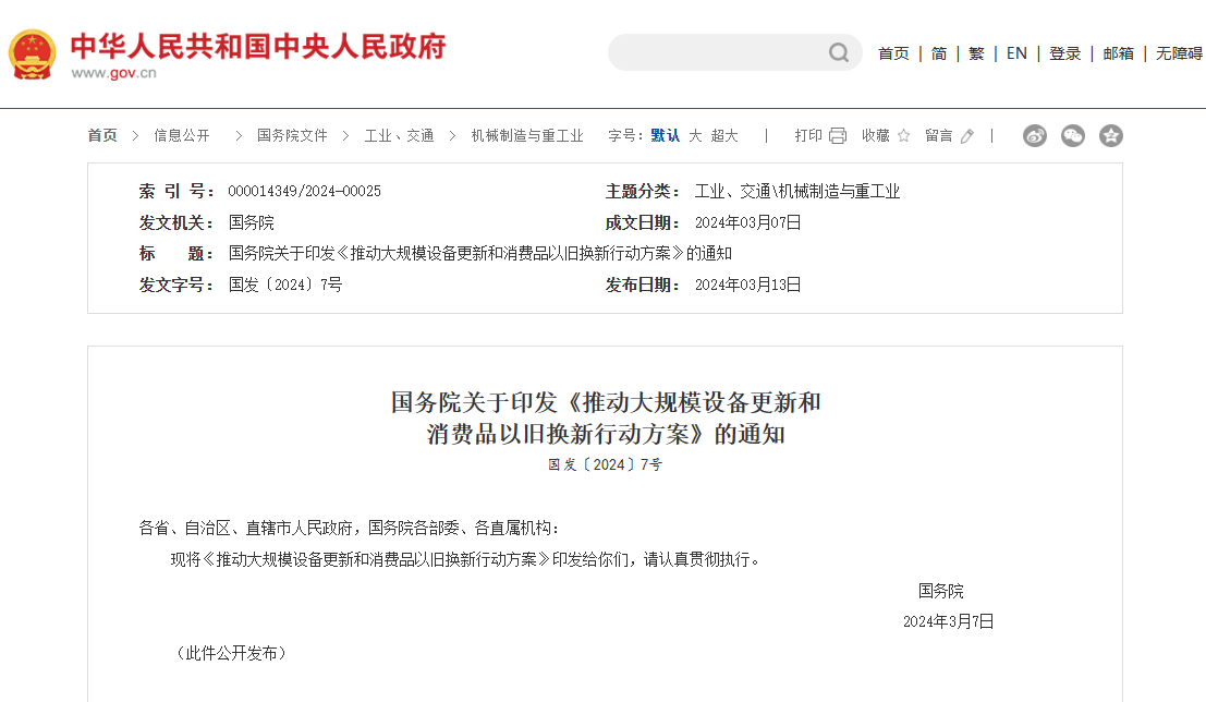 2019-07-05各省、自治区、直辖市人民政府,国务院各部委、各直属机构:现将《推动大规模设备更新和消费品以旧换新行动方案》印发给你们,请认真贯彻执行。